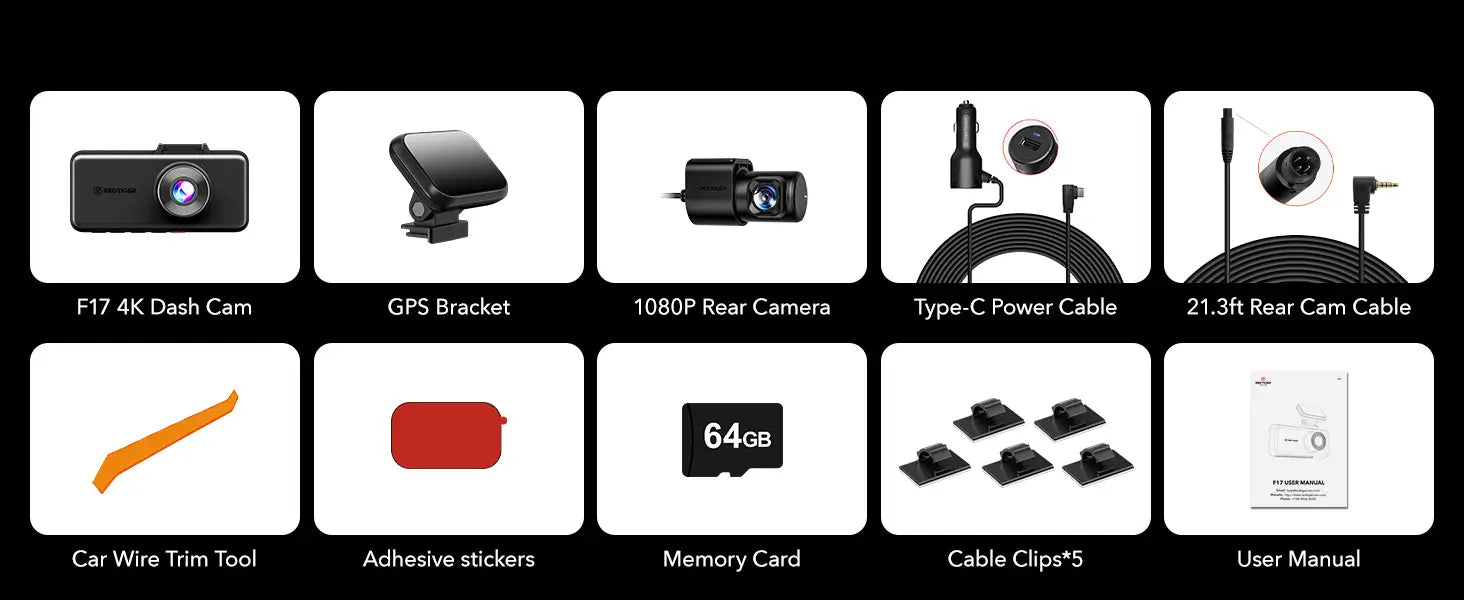 - F17 Basic: F17 Basic includes 4K front & cabin cameras, parking-monitor hardwire kit, 1080p in-car rear camera, 64 GB SD card, and 24-month warranty.