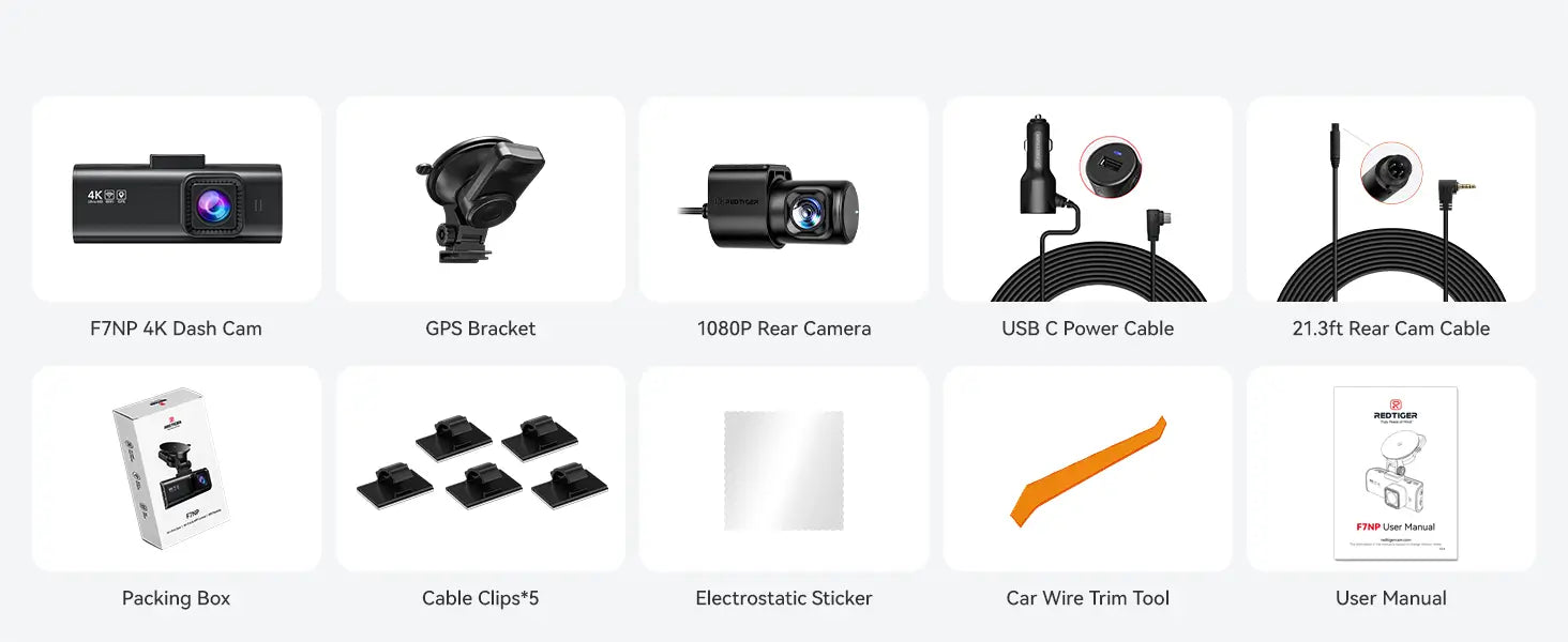 • F7NP Basic: 4K Front + 1080P Incar Rear camera + 32GB SD Card+Free Parking Monitor Hardwire Kit