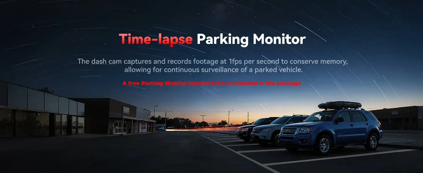This car camera supports seamless loop recording to ensure continuous coverage without interruption. Older files are automatically overwritten when storage is full, while important events are safely locked. A free memory card is included, giving you ample space for 4K recordings and allowing you to use the camera right out of the box. - 24/7 Parking Mode* & G-Sensor